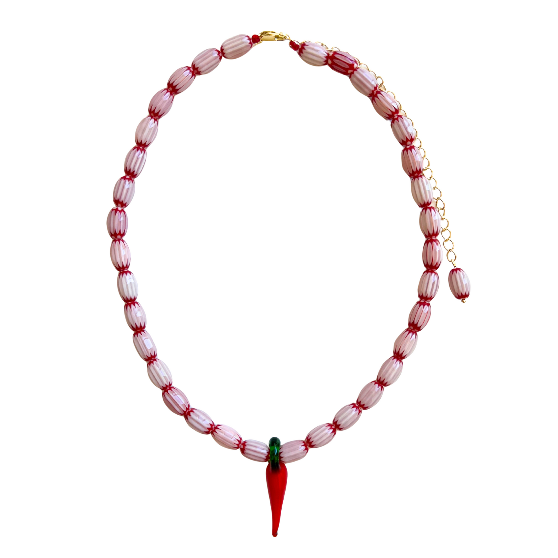 A playful statement piece where fun meets boldness. Hand-strung beads in a red-and-white swirl pattern give a lively, circus-inspired rhythm, while the glass-blown chili pendant adds a cheeky, fiery twist. Lighthearted yet striking, this necklace is made for those who love to stand out with a wink of personality.