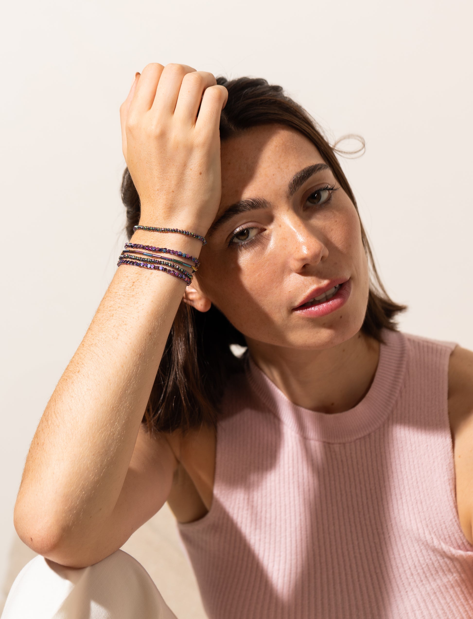 Five metallic strands reflecting hues of purple, green, and blue — an elegant piece that shifts with every move. A statement of mystery and light, all in one stack.